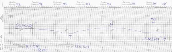 Der Luftdruck befindet sich seit den Eisheiligen Mitte Mai auf Berg- und Talfahrt. Unser Schrieb zeigt den Luftdruckverlauf seit dem 16.05.2016 an unserer Wetterstation in Bonn. Die neue Woche startet in weiten Teilen des Landes mit wechselhaftem Tiefdruckwetter.
