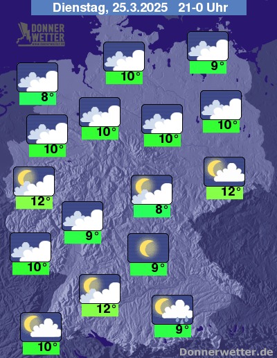Am Dienstagnachmittag zeigt sich der Himmel über dem Süden und Südosten wechselnd oder stark bewölkt, dabei muss zeitweise mit Schauern und lokalen Gewittern gerechnet werden. Auch im Norden und Nordwesten überwiegt am Nachmittag dichte Bewölkung, es bleibt aber weitgehend niederschlagsfrei. Dazwischen bleibt es bei einem Mix aus Sonne und Wolken trocken.