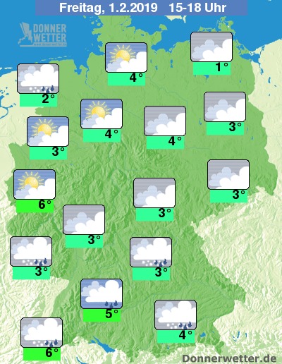 In den Nachmittags- und frühen Abendstunden zeigt sich der Himmel über weiten Landesteilen stark bewölkt oder bedeckt, vor allem in der Nord- und Osthälfte ist der Himmel meist aufgelockert bewölkt. Südlich des Mains sowie an der Nordseeküste muss zeitweise mit Regen, Schneeregen oder Schnee gerechnet werden, sonst bleibt es meist trocken.