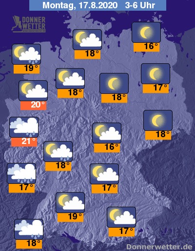 In der bevorstehenden Nacht zieht es sich entlang des Rheins immer weiter zu und im weiteren Verlauf bilden sich hier vielerorts Schauer und örtliche Gewitter. Weiter nach Osten hin ist es mehrheitlich locker bis aufgelockert bewölkt, im Osten und Nordosten verbreitet sternenklar, dazu bleibt es trocken. Die Temperatur sinkt auf tropische 21 Grad in Düsseldorf und bis 16 Grad im Grabfeld.