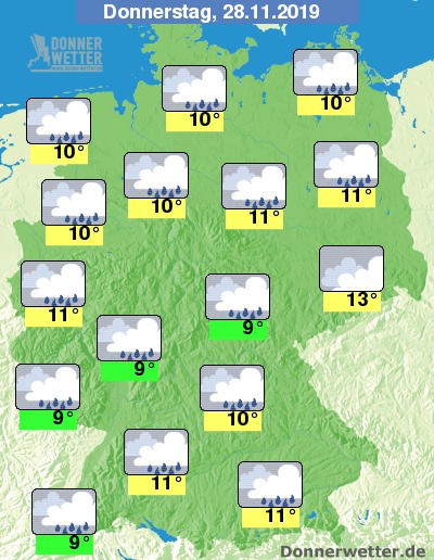 Der Donnerstag zeigt sich überwiegend stark bewölkt oder bedeckt und über den gesamten Tag muss in weiten Landesteilen immer wieder mit Regen gerechnet werden. Dabei weht ein mäßiger bis frischer, im Bergland auch teils stürmischer Wind.
