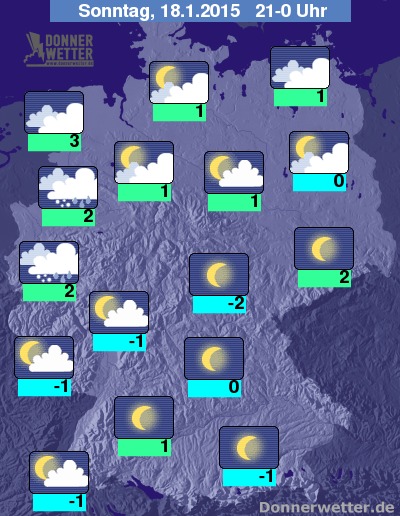 Heute Abend ziehen sowohl im Westen als auch im Nordwesten dichte Wolken auf, die für zeitweiligen Regen, Schneeregen oder Schnee sorgen, dabei wird es teils glatt auf den Straßen. Im Süden und Osten ist es hingegen verbreitet sternenklar oder nur locker bewölkt, sonst ist es meist aufgelockert bewölkt und ebenfalls trocken. Die Abendwerte liegen bei 3 Grad in Oldenburg und um -2 Grad im Vogtland.