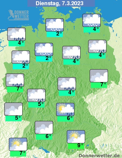 Am Dienstag ist es im Süden oft heiter bis aufgelockert und trocken. Im übrigen Land ziehen hingegen häufig dichte Wolken durch und es fällt gebietsweise Regen, Schneeregen oder Schnee. Die Temperatur steigt auf nasskalte 2 Grad in Hamburg und bis 9 Grad in München. Es weht zudem ein oft starker und böiger Wind, an der See herrscht auch Sturm.