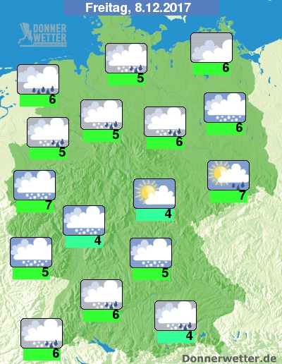 Im Süden und Südosten fällt längere Zeit Regen, dieser geht allmählich bis in tiefere Lagen in Schnee über. Sonst gibt es neben kurzen Aufheiterungen immer wieder teils kräftige Schnee- Schneeregen- und Graupelschauer, dabei kann es örtlich auch mal blitzen und donnern. Lediglich im Nordosten gibt es längere trockene Abschnitte. Die Höchsttemperaturen erreichen meist nur noch Werte zwischen 1 und 7 Grad. Der Wind bleibt gebietsweise sehr lebhaft und böig und kommt aus West bis Nordwest. Daher kann es an der Nordsee in der Nacht auf Samstag auch zu einer Sturmflut kommen. Im übrigen Bereich muss gebietsweise mit weiteren Schneeschauern und verbreitetem Frost gerechnet werden. Es droht regional erhebliche Glätte durch Schnee oder überfrierende Nässe.