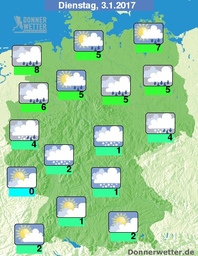 Am Dienstag ziehen überwiegend dichte Wolken über Deutschland hinweg, dabei fällt auch gebietsweise Regen, Schneeregen oder Schnee. Örtlich besteht Glättegefahr! Besonders im Süden scheint jedoch oft die Sonne bei hier meist lockeren Wolken. Die Temperatur steigt auf 0 Grad am Pfälzer Wald und bis auf 8 Grad im nördlichen Emsland.