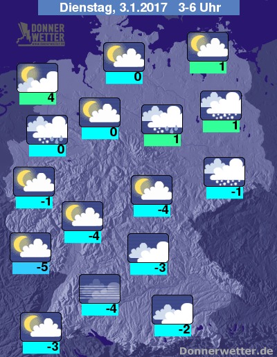 In der bevorstehenden Nacht ziehen von Nordwesten her oft dichte Wolken mit Regen, Schneeregen oder Schnee in den Norden und Osten Deutschlands, dazwischen lockert die Bewölung jedoch auch auf und es bleibt dann trocken. Es besteht oft Glättegefahr! Weiter nach Süden und Westen hin zeigt sich der Himmel überwiegend nur locker bewölkt oder sternenklar, dazu bleibt es trocken. Stellenweise ist Nebel möglich. Die Temperatur sinkt auf 4 Grad an der Nordsee und bis -5 Grad im Saargau.
