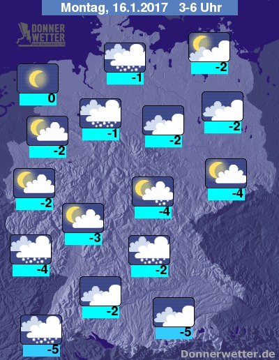 In der folgenden Nacht ist es vor allem im Süden meist bedeckt bei gebietsweisem Schneefall. Sonst ist es teils stark, teils auch mal locker bewölkt und es sind einzelne Schneeschauer möglich. Dabei besteht die Gefahr vor Glatteis oder Schneeglätte! Die Temperatur sinkt auf 0 Grad an der Nordsee und bis -5 Grad im Raum München.
