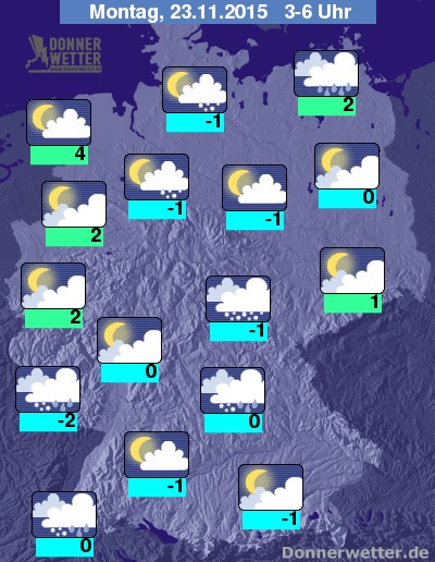 In der Nacht zum Montag lockert die Bewölkung im Nordwesten auf und es bleibt trocken, sonst ist es teils aufgelockert, häufg aber auch stark bewölkt und es kann wiederholt Regen, Schneeregen oder Schnee fallen, dabei besteht erhöhte Glättegefahr. Die Temperatur sinkt auf 4 Grad in Ostfriesland und bis -2 Grad im Saargau.