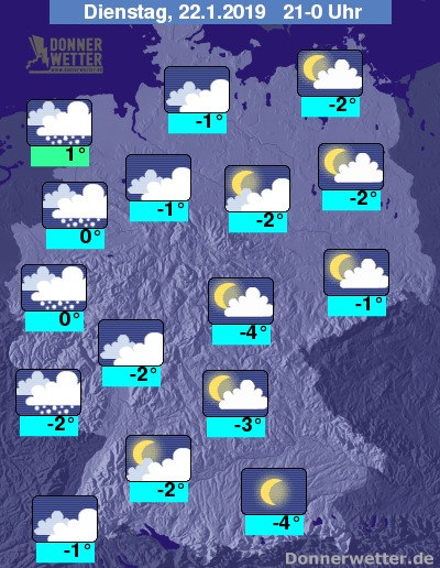 Am Abend fällt im Westen etwas Schnee oder Schneeregen mit Gefahr von Glätte auf Straßen und Gehwegen, sonst bleibt es trocken und vor allem nach Süden und Osten hin zeigen sich häufig auch Mond und Sterne.