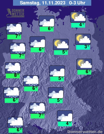 In der Nacht auf Samstag bleibt es im Osten bei gebietsweise Auflockerungen meist trocken, sonst fällt immer wieder Regen. Die Schneefallgrenze sinkt in der Nacht auf 1000 bis 700 m.