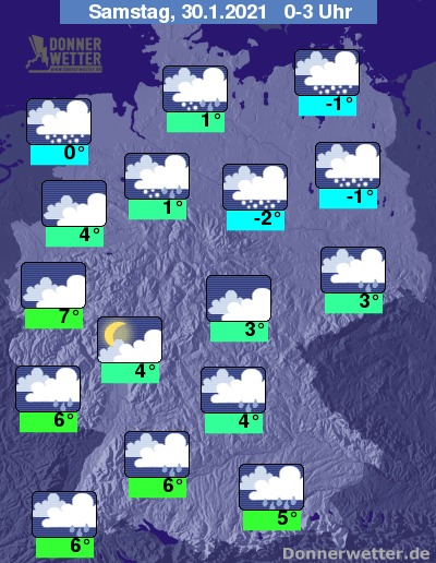 Während der zweiten Nachthälfte trocknet es im Südwesten vorübergehend ab, während in den anderen Gebieten weitere Niederschläge fallen, in Norddeutschland meist in Form von Schnee oder Schneeregen mit erheblicher Rutschgefahr, sonst als leichter Regen oder Sprühregen.