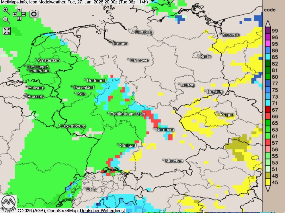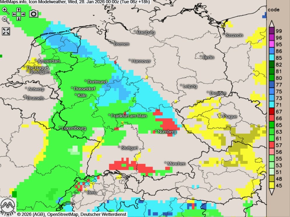 Am Dienstagnachmittag kommen von Westen und Südwesten Niederschläge auf, die bis zum Abend auch die Landesmitte erreichen. Vor allem in den Mittelgebirgen muss am Abend, in der Nacht sowie Mittwochfrüh zeit- und gebietsweise mit gefährlicher Glätte durch gefrierenden Regen oder kräftiger Schneefall gerechnet werden.