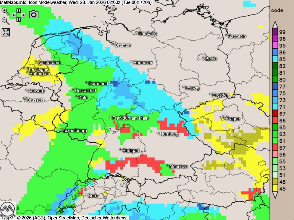 Die Wetterkarten für 18:00, 20:00, 00:00 und 02:00 Uhr mit Eisregengebieten (rot) nach ICON:
