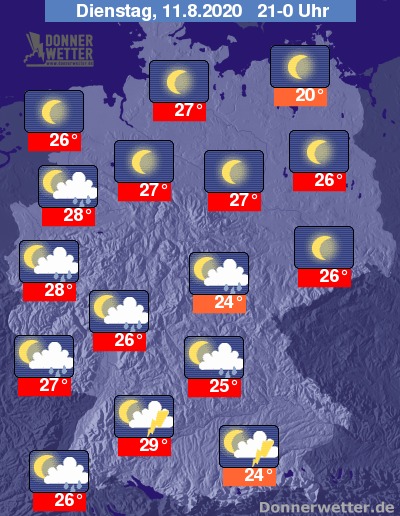 Bis zu den Frühstunden kühlt die Luft auf 16 bis 20 Grad ab, im Südwesten und Westen gibt es teilweise wieder eine tropische Nacht mit Temperaturen oberhalb der 20 Grad - Marke.