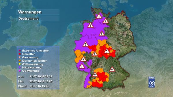 Der Deutsche Wetterdienst warnt aktuell in der Mitte des Landes, sowie besonders über Baden-Würtemberg verbreitet vor möglichen Unwettern. Eine Hitzewarnung besteht derweil insbesondere für Niedersachsen, NRW und Teile Südwestdeutschlands.