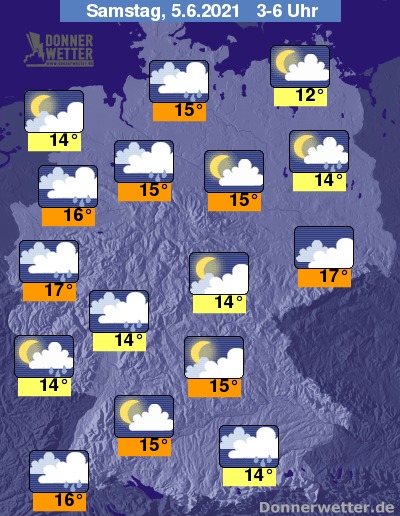 In der Nacht auf Samstag bleibt der Himmel verbreitet wechselnd oder stark bewölkt, lockere Wolken halten sich in den nächsten Stunden vor allem an den Küsten, im Nordosten sowie der Landesmitte. Hier bleiben die Nachtstunden dann auch weitgehend niederschlagsfrei, südlich der Donau und in der Westhälfte muss dagegen verbreitet mit Schauern und einzelnen Gewittern gerechnet werden.