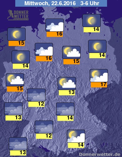 In der folgenden Nacht sind anfangs vom Westen bis in die Mitte noch einzelne Schauer oder etwas Regen möglich. Im Norden halten sich ebenfalls oft dichte Wolken, wobei es hier weitgehend trocken bleibt. Im übrigen Bundesgebiet ist es dagegen meist locker bis aufgelockert bewölkt, vor allem im Süden und Nordosten verbreitet auch sternenklar, dabei bleibt es trocken. Die Temperatur sinkt auf 17 Grad in Leipzig und auf etwa 12 Grad in Konstanz.