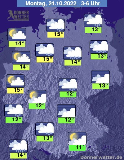 In der Nacht zum Montag ziehen verbreitet dichte Wolken durch, dabei bilden sich gebietsweise Schauer. In der zweiten Nachthälfte lockert der Himmel im Nordwesten und Westen vielerorts auf und es bleibt dazu trocken. Im übrigen Land sind noch vereinzelt, im Süden vielerorts Schauer möglich. Die Temperatur sinkt auf 15 Grad in Hamburg und bis 11 Grad in München.