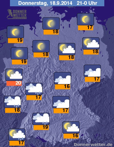 Am Abend ändert sich an der Wettersituation nur wenig, denn in der Nordhälfte bleibt es weiterhin vielfach wolkenlos oder nur gering bewölkt und trocken, während vor allem nach Südwesten hin teils dichte Wolken mit möglichen Schauern und Gewittern durchziehen, auch nach Südosten hin ziehen einige Wolken durch, jedoch bleibt es hier weitgehend trocken. Die Temperatur liegt am Abend noch bei sehr milden 20 Grad in der Kölner Bucht und etwa 16 Grad in Niederbayern.