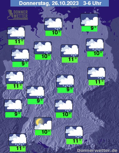 In der Nacht zum Donnerstag ziehen überwiegend kompakte Wolken übers Land hinweg. Gebietsweise aufgelockert bewölkt und meist trocken ist es über Baden-Württemberg, sonst fällt immer wieder und teilweise auch kräftiger Regen. Die Temperatur sinkt auf 11 Grad in Köln und etwa 9 Grad in Erfurt.