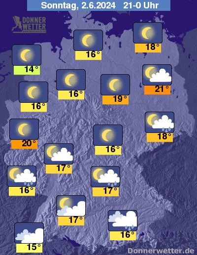 Am Sonntagnachmittag sind im Süden und Südosten zeitweise Schauer möglich, dabei muss auch mit lokalen, teils kräftigen Gewittern gerechnet werden. Auch im Osten der Republik Gewitter, teils auch mit unwetterartigem Starkregen. In den übrigen Landesteilen ist es heiter bis wolkig und es bleibt meist niederschlagsfrei. In Küstennähe scheint die Sonne auch von einem wolkenlosen Himmel.