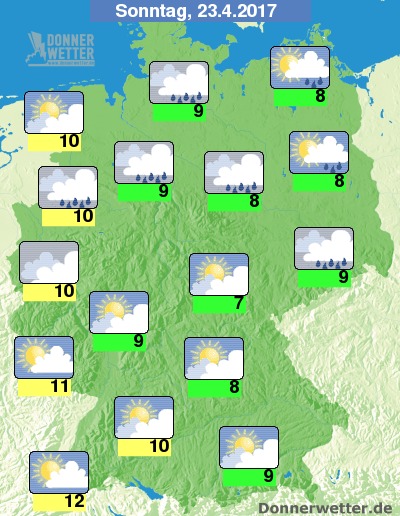Am heutigen Sonntag bringen kompakte Wolken vor allem dem Norden und dem Osten gebietsweise Schauer. Viele und teils dichte Wolken halten sich jedoch auch über dem Süden und Westen, hier bleibt es jedoch weitgehend trocken. Im Südwesten ist es sogar häufig heiter. Die Temperatur erreicht nur kühle 7 Grad im Thüringer Becken und bis 12 Grad im Breisgau.