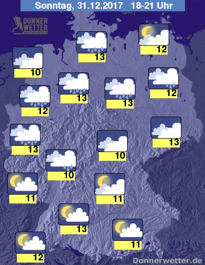Am Neujahrstag ist es teils locker bis aufgelockert, teilweise ist es aber auch stark bewölkt, dazu können sich hin und wieder einzelne Schauer bilden, oft ist es aber auch trocken. Die Temperatur steigt auf 7 bis 10 Grad.