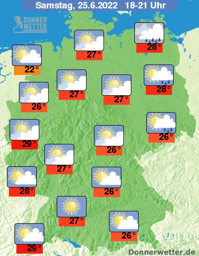 Am Sonntag bleibt es im Süden meist sonnig und trocken, im übrigen Bundesgebiet ist es teils heiter, teils ziehen einige Quellwolken auf, dabei bilden sich lokale Schauer und auch Gewitter sind möglich. Die Temperatur erreicht 21 Grad an der Nordsee und bis 33 Grad in der Magdeburger Börde.