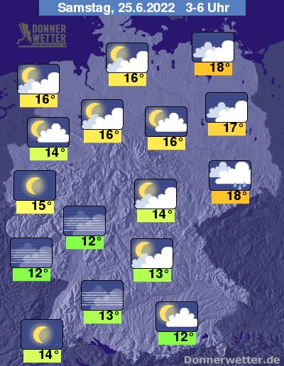 In der Nacht zum Samstag klingen letzte Schauer in den östlichen Landesteilen ab und von Westen her lockert die Bewölkung nach und nach auf. In der zweiten Nachthälfte ist es über dem Süden und Westen verbreitet sternenklar, sonst bleibt es bei teils starker, teils aufgelockerter Bewölkung. Die Temperatur sinkt auf 18 Grad in Dresden und 12 Grad in Saarbrücken.