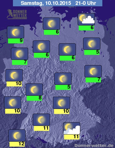 Heute Abend halten sich am Alpenrand oft dichte Wolken, die hier und da etwas Regen bringen können. Im großen Rest des Bundesrepublik ist es dagegen weitgehend sternenklar und dabei trocken. Einige Wolken können jedoch im Ostseeumfeld durchziehen, dazu bleibt es aber ebenfalls trocken. Die Abendtemperatur liegt bei 12 Grad in Freiburg und um 5 Grad im Eichsfeld.