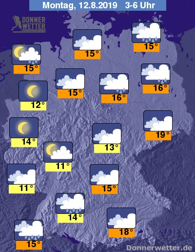 In der bevorstehenden Nacht halten sich besonders über dem Süden, aber auch über dem Osten dichte Wolken und es fällt zum Teil kräftiger und gewittriger Regen. Über der Nordwesthälfte ist es hingegen oft nur gering bis wechselnd und nur vorübergehend auch mal stark bewölkt, dazu bleibt es hier weitgehend trocken. Die Temperatur sinkt auf 19 Grad in Dresden und bis 11 Grad am Westerwald.