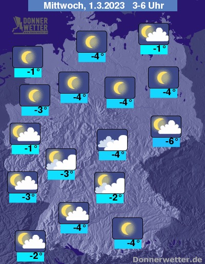In der Nacht zum Mittwoch halten sich über der Südhälfte gebietsweise dichte Wolken, teils ist es hier aber auch nur locker bewölkt bis sternenklar. Über der Nordhälfte der Republik ist es weitgehend sternenklar. Es bleibt trocken bei Tiefstwerten von -1 Grad im nördlichen Emsland und -6 Grad in der Lausitz.