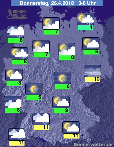 Am Donnerstag ist es über der Südhälfte des Landes meist heiter bis aufgelockert bewölkt und meist trocken, sonst ist es wechselnd bis stark bewölkt und es bilden sich zeitweise Schauer, örtlich sind auch Gewitter möglich. Die Temperatur erreicht 11 Grad im nördlichen Emsland und bis 16 Grad im Oberrheingraben.