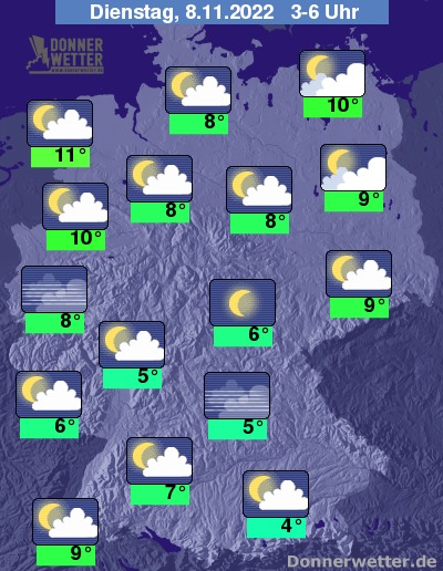 In der kommenden Nacht zeigt sich der Himmel häufig nur locker bewölkt oder sogar sternenklar, gebietsweise hält sich jedoch auch dichte Bewölkung. Stellenweise kann sich Nebel bilden. Es bleibt trocken bei Tiefstwerten von 11 Grad in Cuxhaven und 4 Grad in Augsburg. An der Ostsee weht teils, an der Nordsee häufig stürmischer Wind.