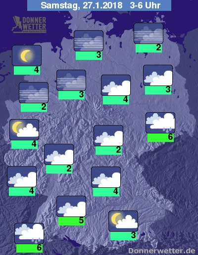 In der Nacht zum Samstag klart der Himmel über dem Westen und Norden, wie zuvor schon im Nordwesten mehr und mehr auf. Im Südosten ist es ebenfalls teils sternenklar, teils locker bis aufgelockert bewölkt und trocken. Über der übrigen Südosthälfte des Landes halten sich hingegen dichte Wolken, dabei fällt über Sachsen und Baden-Württemberg gebietsweise Regen, sonst bleibt es trocken. Die Temperatur sinkt auf 6 bis 2 Grad.