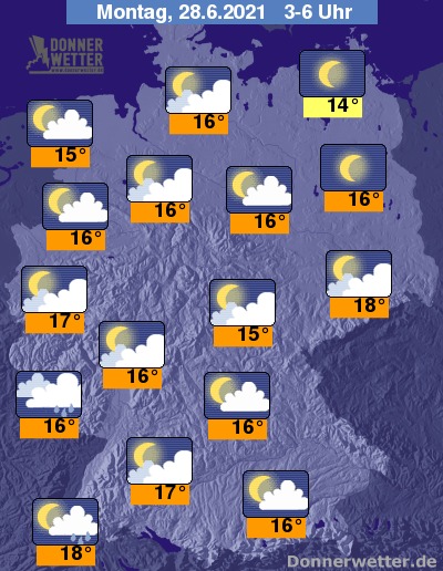 In der folgenden Nacht ziehen vor allem über den Ober- und Mittelrhein teils kompakte Wolken hinweg, dabei bilden sich lokale Schauer und einzelne Gewitter. Auch im übrigen Süden und Westen ist es teils stark, teils auch aufgelockert bewölkt, dazu jedoch weitgehend trocken. Weiter nach Nordosten hin ist es verbreitet locker bewölkt oder sternenklar, dazu bleibt es trocken. Die Temperatur sinkt auf 18 Grad in Freiburg und bis 14 Grad in Rostock.