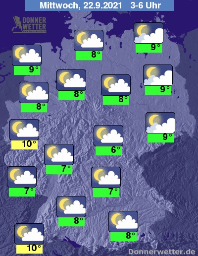 In der Nacht zum Mittwoch ist es häufig locker bis aufgelockert, hier und da auch stärker bewölkt oder neblig-trüb, dazu bleibt es trocken. Die Temperatur sinkt auf 10 Grad am Ober- und Mittelrhein und bis 6 Grad im Vogtland.