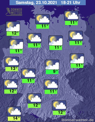 Heute Abend zeigt sich der Himmel meist gering bis locker bewölkt. Vom Niederrhein bis ins Emsland ist es aber auch gebietsweise stark bewölkt, dazu bleibt es trocken. Die Temperatur liegt bei 9 Grad in Erfurt und bis 14 Grad in Freiburg.