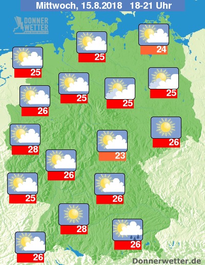 Heute Abend ist es überwiegend heiter bis sonnig, hier und da auch wechselnd wolkig, dabei bleibt es überall trocken. Die Temperatur liegt bei 24 Grad in Stralsund und bis 28 Grad in Düsseldorf.