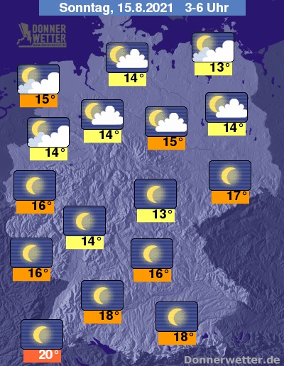 In der Nacht zum Sonntag bleibt der Himmel über der Südhälfte Deutschlands sternenklar. Im Norden ziehen hingegen schon oft einige und teils dichte Wolken durch. Im Laufe der Nacht nimmt die Bewölkung hier noch weiter zu, dazu bleibt es trocken. Die Temperatur sinkt auf tropische 20 Grad in Freiburg und bis 13 Grad in Neubrandenburg.