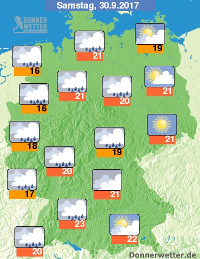 Heute bleibt es nur von Vorpommern, über Berlin-Brandenburg bis nach Sachsen weitgehend heiter bis sonnig und trocken, ansonsten dominieren dichte Wolken den Himmel und es fällt immer wieder, oft auch kräftiger und gewittriger Regen. Über Bayern bleibt es meist noch trocken. Die Temperatur liegt bei 16 Grad an der Ems und bis 23 Grad im Raum Stuttgart.