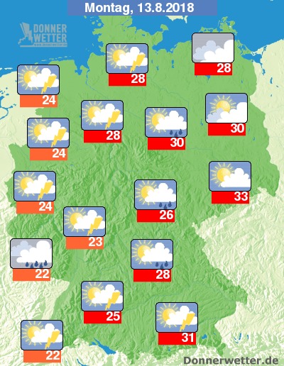 Zum Start in die Woche bleibt es über den östlichen Landesteilen noch bis in den späten Nachmittag hinein meist heiter und trocken, sonst ziehen von Westen hingegen immer wieder dichte Wolken durch und es bilden sich verbreitet Schauer und vielerorts auch Gewitter. Die Temperatur erreicht 22 Grad am Pfälzer Wald und bis 33 Grad in der Lausitz.
