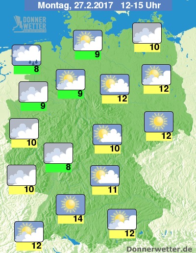 Heute Nachmittag ist es über den westlichen Landesteilen schon verbreitet bedeckt, jedoch zum Großteil noch trocken, Regen fällt jedoch schon im Nordwesten des Landes und breitet sich langsam auch weiter nach Osten hin aus. Vor allem im Süden und Osten Deutschlands ist es verbreitet heiter oder sonnig und trocken. Im übrigen Bundesgebiet teils stark, teils aufgelockert bewölkt und dazu ebenfalls trocken. Es werden 8 bis 14 Grad erreicht.