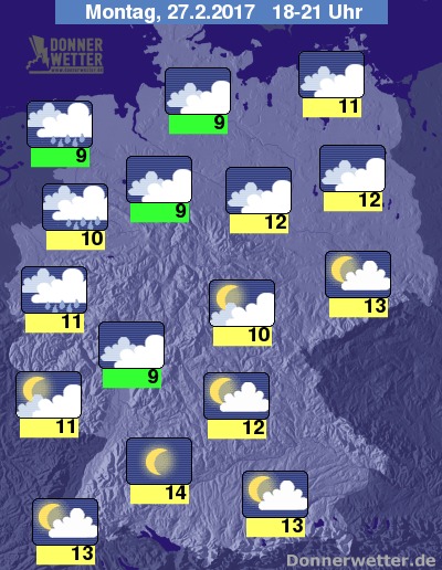 Heute Abend fällt vom Mittel- bis zum Niederrhein und dem Emsland verbreitet Regen, der Niederschlag breitet sich weiterhin nach Osten hin aus. Über der Osthälfte und in Süddeutschland bleibt es bei teils leichter, teils starker Bewölkung trocken. Die Abendwerte liegen zwischen 9 und 14 Grad.