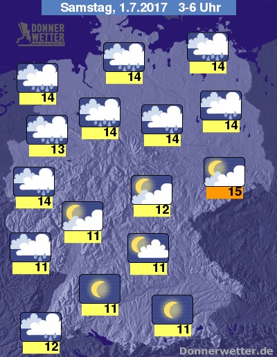 In der folgenden Nacht bleibt es im Norden zumeist sehr verregnet, im Süden zeigt sich der Himmel hingegen meist sternenklar und auch in der breiten Landesmitte lockert die Bewölkung häufiger auf, hier sind nur noch vereinzelt Schauer möglich, sonst bleibt es trocken. Die Temperatur sinkt auf 15 Grad in Dresden und bis 11 Grad am Westerwald.