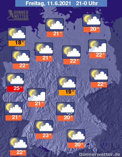 In den Abendstunden ist der Himmel teils heiter, teils locker, über der Nordhälfte auch aufgelockert bewölkt. Vor allem im norddeutschen Tiefland sind am Abend noch einzelne Schauer möglich, im Süden kann es auch noch lokale Gewitter geben. Bis Mitternacht nimmt die Schaueraktivität dann ab, so dass es nur noch im äußersten Südosten und am Alpenrand etwas tröpfeln kann.