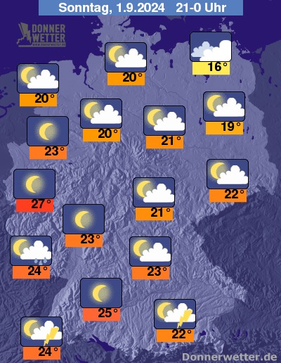 In der Nacht zum Montag ist der Himmel über dem Südwesten und am Alpenrand meist wechselnd bewölkt und es muss mit lokalen Schauern und Gewittern gerechnet werden. In den übrigen Landesteilen ist es sternenklar oder nur gering bewölkt und es bleibt meist niederschlagsfrei.