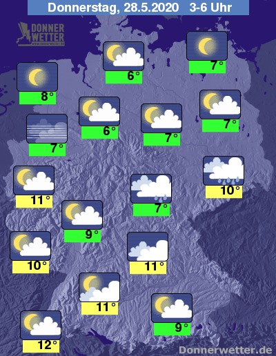 Bis zu den Frühstunden kühlt die Luft auf 5 bis 10 Grad ab, im Südwesten halten sich die Temperaturen meist im zweistelligen Bereich auf.