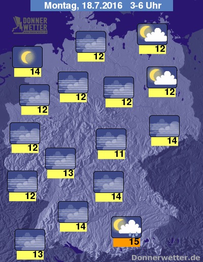 In der folgenden Nacht sind im Süden anfangs noch gebietsweise Schauer und Gewitter möglich. Über dem übrigen Bundesgebiet ist es dagegen verbreitet sternenklar oder nur leicht bewölkt, im Nordosten und Osten zieht oft lockere Bewölkung durch, dabei bleibt es trocken. Stellenweise bildet sich Dunst oder Nebel. Die Temperatur sinkt auf 15 Grad in München und bis auf 11 Grad im Vogtland.