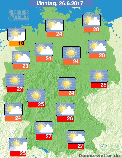 Am Montag herrscht über weiten Landesteilen heiteres bis sonniges Wetter. Gebietsweise wolkiger ist es jedoch vor allem im Südwesten, jedoch auch über dem Norden des Landes, dazu ist jedoch kein Regen zu erwarten. Die Höchstwerte liegen bei 18 Grad an der Nordseeküste und bis 27 Grad in Stuttgart.